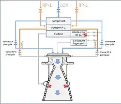 - Abandon des 3 turbopompes (hydrazine, RP-1 et LOX) au profit d'une seule turbopompe commune au RP-1 et LOX.