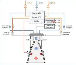 - L'éthylène-glycol, l'eau sont injectés dans la chambre de combustion accroissant la pression dans celle-ci. L'éthylène glycol produit une pression moindre dans la chambre de combustion que le RP-1 ce qui permet une augmentation de pression progressive à fur et à mesure que le RP-1 vient purger l’éthylène glycol du circuit d'admission.