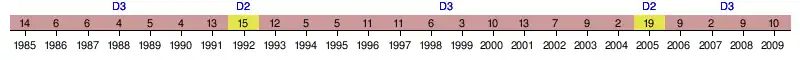 | 1987 | 6e | 29 | 28 | 11 | 7 | 10 | 19 | 20 | -1 | ||