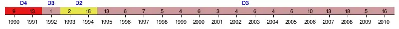 | 1995 | 3e Ouest | 13e | 55 | 42 | 17 | 4 | 21 | 64 | 66 | -2 | — |