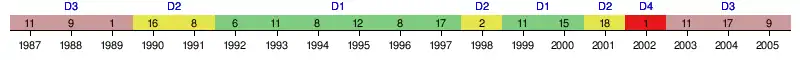 | 2005 | 9e | 51 | 36 | 13 | 12 | 11 | 46 | 47 | -1 | Deuxième tour | |