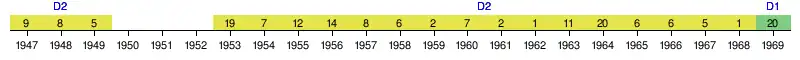 1969 1er 20e 22 34 7 8 19 19 39 -20 Seizièmes de finale