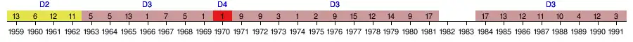 | 1970 | 4e Russie 1 | 1er | 46 | 32 | 16 | 14 | 2 | 36 | 17 | +19 | |