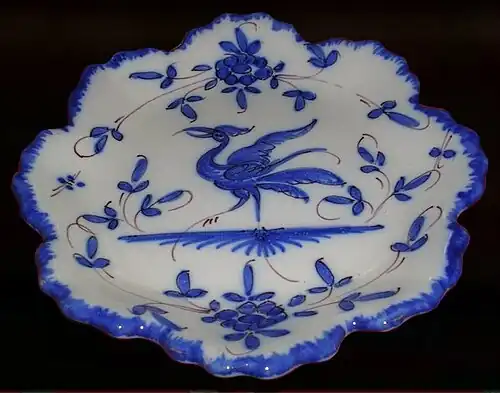 Coupelle en faïence grand feu du XIXe siècle. Le décor d'échassier, héron ou ibis, est caractéristique du style des faïences de Martres-Tolosane.