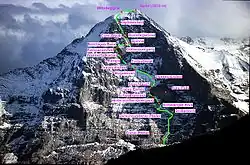 - Directissime (voie Harlin) : mars 1966 par John Harlin (qui y meurt), Dougal Haston et Layton Kor ; première hivernale de cette voie en 1970 par une grosse équipe japonaise avec de nombreuses cordes fixes ; première hivernale solitaire le 16 janvier 1990 par Slavko Sveticic en s'aidant beaucoup des cordes fixes[6].