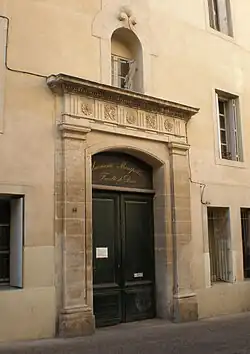 La faculté de droit aménage en 1956 dans les anciens bâtiments du couvent des sœurs de la Visitation Sainte-Marie qui datent du XVIIe siècle (1631)[38], de même que la chapelle (à l'angle de la rue de l'Arc-des-Mourgues). Le plan du couvent se présente sous la forme d'un grand bâtiment carré, d'ordonnance et d'élévation classiques sévères. Autour du cloître central se développent trois corps de bâtiments, des cellules ainsi que des salles de classe. En 1680, date à laquelle les travaux du couvent sont achevés, cet ensemble religieux s'agrandit par l'adjonction d'un grand jardin qui jouxte désormais la Porte de la Blanquerie.