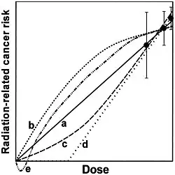 « Vu le mécanisme en plusieurs étapes de la carcinogenèse, on ne sait pas si la linéarité dose-effet pour la lésion primaire complexe de l'ADN et les lésions cellulaires fixées, qui sont critiques, entraîne une relation dose-effet linéaire en ce qui concerne les cancers induits par l'exposition aux rayonnements»[72].