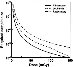 Ainsi, sur la base du modèle linéaire sans seuil, 500 personnes exposées suffisent , théoriquement, à détecter (8 fois sur 10) les effets d'une dose de 1 000 mSv. Pour détecter les effets d'une dose dix fois moindre (100 mSv),il faut une population exposée d'au moins 50 000 personnes. Et pour 10 mSv il faudrait une cohorte 100 fois plus grande (soit 5 millions de personnes exposées)[19].