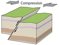 Une faille inverse, ou chevauchement accompagne une compression ; le compartiment au-dessus de la faille ("toit") monte par rapport au compartiment situé en dessous de la faille ("mur").