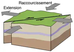 Représentation schématique d'une faille décrochante, ici un décrochement sénestre.