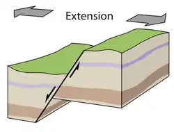 Une faille normale accompagne une extension ; le compartiment au-dessus de la faille ("toit") descend par rapport au compartiment situé en dessous de la faille ("mur"). La géométrie obtenue entre des failles normales de pendage convergent opposé est appelée graben. L'inverse (faille normale de pendage divergent opposé) correspond à un horst.