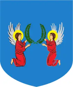 Les armes des Angeli sont d'azur à deux anges vêtus de gueules ailés d'argent affrontés tenant ensemble des deux mains une couronne de laurier au naturel.