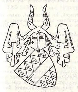 Le blason montre une barre rouge en argent accompagnée de sept réveils bleus. Sur le casque avec des couvertures bleu-argent deux cornes de buffle marquées comme le bouclier.[réf. nécessaire]