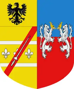 Les armes des Burovich[5] sont parti au premier d'or à trois fleurs-de-lis d'argent rangés entre deux filets en fasces d'argent à une barre de gueules brochant sur le tout et chargé d'une lance de tournoi d'argent au chef d'or chargé d'une aigle de sable becquée et membrée de gueules ; au second coupé d'azur sur gueules à deux lions affrontés d'argent brochant sur le coupé et tenant chacun une corne d'abondance d'or de telle manière que chaque lion tient le pied de la corne d'abondance de l'autre lion et que les deux cornes sont passées en sautoir.