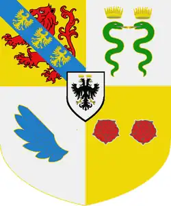 - au premier quartier d'argent avec un Lion de gueules et une bande d'azur chargée de trois aigles d'or brochant sur le tout;