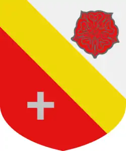 Les armes des Martine sont tranché d'argent à une rose de gueules sur gueules à une croisette d'argent à la bande d'or brochant sur le tranché.