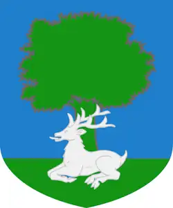 - au 2e de même azur avec un arbre sur un terrain de sinople avec un cerf d'argent couché aux pieds de l'arbre.
