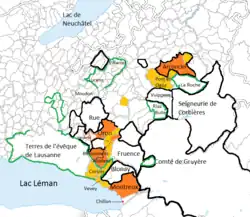 Durant la première moitié du XIIIe siècle, la famille d'Oron est vassale des comtes de Genève[69], bien que cet hommage soit fait sans reprise en fief de la moindre terre[70]. Guillaume d'Oron aurait prêté hommage à l'évêque de Lausanne Roger de Vico Pisano[32]. En échange de compensations financières, les membres de la famille auraient ensuite prêté hommage à Pierre de Savoie en 1256[71], mais les seules terres des Oron qui sont des fiefs savoyards sont les nouvelles terres acquises par Amédée d'Oron-Bossonnens-Attalens à l'est de sa seigneurie.