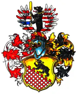 Un ours noir marchant avec un collier argenté en or sur un mur crénelé diagonal rouge et argent. Sur le casque aux lambrequins noires et dorées à droite et rouges et argentées à gauche, l'ours grandit, tenant une rame dorée dans ses pattes entre un vol ouvert de hérons argentés. L'aile droite a 4 bandes (rouge, rouge, bleu, rouge), l'aile gauche a six bandes rouges.