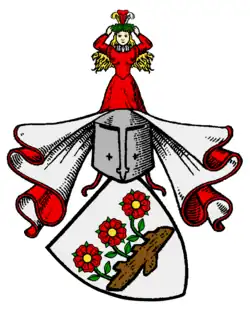 En argent, une branche naturelle allongée et tronquée d'où poussent trois roses rouges sur des tiges de feuilles vertes. Sur un casque avec une couverture rouge et argent, pousse une vierge vêtue de rouge, avec une couronne verte ornée de plumes d'autruche or, rouge et argent sur la tête.