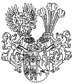 Écartelé, 1 et 4 en rouge un lion d'argent à deux queues, 2 et 3 en or un lys bleu. Sur le casque avec lambrequins bleu-or à droite et rouge-argent à gauche, un lion argenté à deux queues avec un lys bleu dans la patte gauche poussant entre un vol noir ouvert.