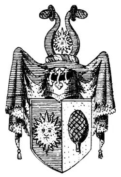 Les armoiries de 1708 avec les armoiries de la famille en guise de bouclier de cœur sont écartelées, 1 et 4 avec un aigle noir dans le champ doré et 2 et 3 avec des croissants horizontaux blancs et des barres dans le champ rouge[1].