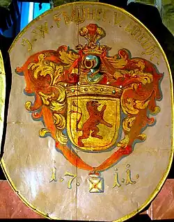 Le blason baronnial augmenté est écartelé. Les champs 1 et 4 montrent chacun un demi-aigle argenté de gueules à l'écart. Les champs 2 et 3 sont divisés de gueules et noir. L'écusson en cœur montre le blason familial original avec le lion. Il y a trois casques : Le premier cimier est composé de trois plumes d'autruche, une dorée entre deux de gueules. Les lambrequins associés sont de gueules et dorés. La deuxième cimier montre une ancre argentée avec des lambrequins noirs et de gueules. La troisième cimier est un dé argenté entre des cornes de gueules et noires.