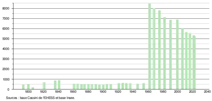 L'évolution du nombre d'habitants est connue à travers les recensements de la population effectués dans la commune depuis 1793. Pour les communes de moins de 10 000 habitants, une enquête de recensement portant sur toute la population est réalisée tous les cinq ans, les populations de référence des années intermédiaires étant quant à elles estimées par interpolation ou extrapolation[23]. Pour la commune, le premier recensement exhaustif entrant dans le cadre du nouveau dispositif a été réalisé en 2006[24].