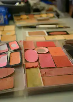 Le fard à paupières(en) ou ombre à paupières se présente généralement sous forme de poudre compactée qui s'applique avec un pinceau ou à la main.