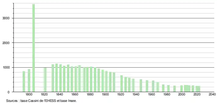 L'évolution du nombre d'habitants est connue à travers les recensements de la population effectués dans la commune depuis 1793. Pour les communes de moins de 10 000 habitants, une enquête de recensement portant sur toute la population est réalisée tous les cinq ans, les populations de référence des années intermédiaires étant quant à elles estimées par interpolation ou extrapolation[45]. Pour la commune, le premier recensement exhaustif entrant dans le cadre du nouveau dispositif a été réalisé en 2004[46].