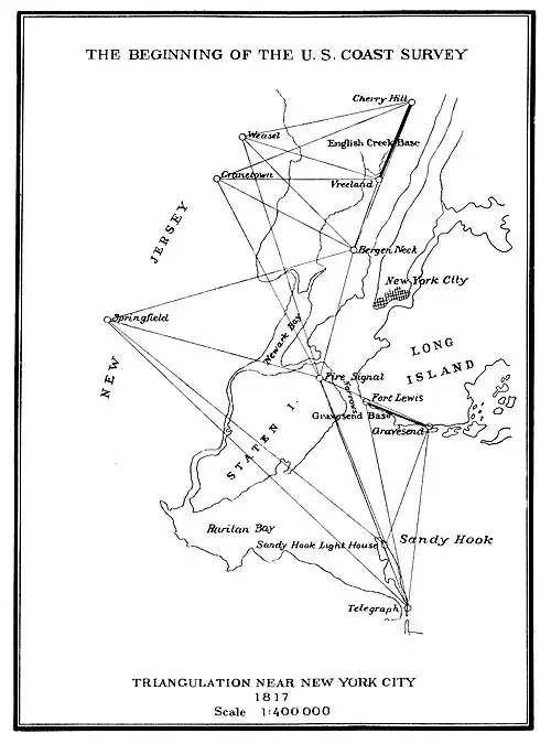 Le , Hassler commence sa triangulation à la station de Buttermilk dans le comté de Westchester, état de New York[1]. Il poursuit son travail en direction du sud et atteint en 1843 le sud du New Jersey[1]. Après avoir terminé les observations de la vingt-quatrième station, nommée Burden, il se rend dans l'État du Delaware, où il est grièvement blessé au cours d'une tempête en essayant de mettre ses instruments à l'abri[1]. Il revient chez lui à Philadelphie et décède le avant d'avoir pu publier ses résultats[2],[1].