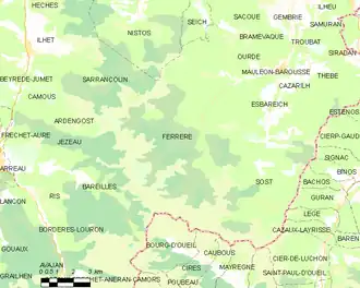 Ferrère est limitrophe de douze autres communes, dont trois dans le département de la Haute-Garonne. Parmi elles, la commune de Caubous n'est limitrophe au sud-ouest de Ferrère que par un simple quadripoint, au Cap de Pouy Pradaus.