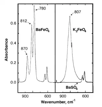 Des pics d'absorption infrarouge du ferrate de baryum sont observés à 870, 812, 780 cm−1[7].
