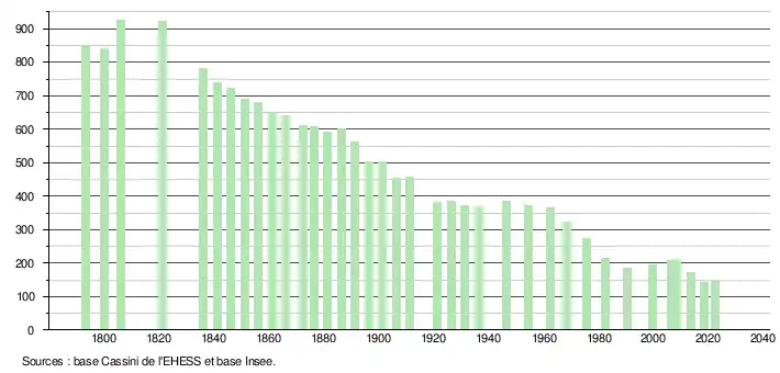 L'évolution du nombre d'habitants est connue à travers les recensements de la population effectués dans la commune depuis 1793. Pour les communes de moins de 10 000 habitants, une enquête de recensement portant sur toute la population est réalisée tous les cinq ans, les populations de référence des années intermédiaires étant quant à elles estimées par interpolation ou extrapolation[32]. Pour la commune, le premier recensement exhaustif entrant dans le cadre du nouveau dispositif a été réalisé en 2008[33].