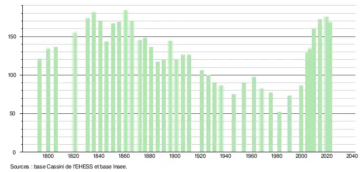 L'évolution du nombre d'habitants est connue à travers les recensements de la population effectués dans la commune depuis 1793. Pour les communes de moins de 10 000 habitants, une enquête de recensement portant sur toute la population est réalisée tous les cinq ans, les populations de référence des années intermédiaires étant quant à elles estimées par interpolation ou extrapolation[17]. Pour la commune, le premier recensement exhaustif entrant dans le cadre du nouveau dispositif a été réalisé en 2004[18].