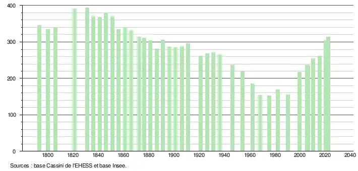 L'évolution du nombre d'habitants est connue à travers les recensements de la population effectués dans la commune depuis 1793. Pour les communes de moins de 10 000 habitants, une enquête de recensement portant sur toute la population est réalisée tous les cinq ans, les populations de référence des années intermédiaires étant quant à elles estimées par interpolation ou extrapolation[18]. Pour la commune, le premier recensement exhaustif entrant dans le cadre du nouveau dispositif a été réalisé en 2005[19].
