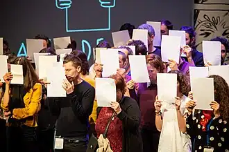 Marion Montaigne, Younn Locard, Florent Grouazel, Nicole Claveloux, Yoshiharu Tsuge, Emmanuel Guibert, Stéphane Beaujean, les auteurs et autrices sur la scène de la cérémonie des Fauves, Yoon-sun Park, des lectrices de Sacrées Sorcières de Pénélope Bagieu. | ||||||||