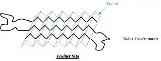 Les feuillets β ou feuillets β plissés est la deuxième forme de structure secondaire régulière observée dans les protéines, avec une fréquence de présence plus faible que les hélices α. Les feuillets β sont constitués de brins bêta (brins β) reliés latéralement par au moins deux ou trois liaisons hydrogène entre des atomes du squelette carboné de la chaine polypeptidique pour former un plan plissé (comme un accordéon), généralement tordu. Un brin β est une partie de la chaine polypeptidique formé en moyenne de trois à dix acides aminés dont la chaine carbonée principale est étendue. L'association de nombreux feuillets β est observée dans l'agrégation de protéines, dans de nombreuses maladies humaines, notamment les amyloses telles que la maladie d'Alzheimer.