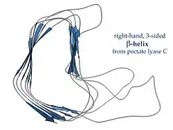 Une hélice parallèle β est formée de la répétition de deux ou trois brins β reliés par de courtes boucles, ces unités de répétition se superposent l'une au-dessus de l'autre et les feuillets β superposés sont organisés de façon parallèle. Dans les hélices β gauche, les brins sont simples et sans torsion, les surfaces formées sont pratiquement plates et forment un prisme régulier (voir schéma de l'anhydrase carbonique). L'enzyme synthétisant le lipide A (lpxA) ou les protéines d'insectes antigel sont d'autres exemples de cette structure[9]. Les hélices β droites comme la pectate lyase présentent des sections transversales moins régulières, la partie moins régulière est souvent impliquée dans un site actif ou un site de liaison[10].
