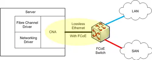 La mise en œuvre de FCoE suppose l'utilisation de nouveaux types d'adaptateurs côté serveur, appelés CNA (Converged Network Adapter), par lesquels transitent à la fois les trames réseau vers le LAN et les données vers le SAN. Ces cartes peuvent laisser le pilote se charger de la construction des trames FCoE ou inclure un processeur qui décharge l'unité centrale de ce travail (comme c'est déjà le cas avec TCP (en)).
