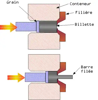 La billette (cylindre plein de métal) de métal préalablement chauffée est placée dans le conteneur. Un poinçon exerce une poussée. Le métal est d'abord plaqué contre la filière et file à travers elle en prenant sa forme définitive[3].