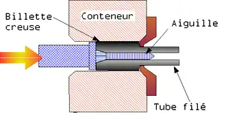 Le poinçon est équipé d'une aiguille qui est emmanchée sur la billette creuse. En poussant dans la filière, le métal est contenu entre la filière et l'aiguille. On obtient un tube monobloc sans soudure.
