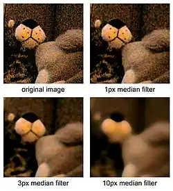 Le filtre médian est un filtre numérique non linéaire, souvent utilisé pour la réduction de bruit. La réduction de bruit est une étape de prétraitement classique visant à améliorer les résultats de traitements futurs (détection de bords par exemple). La technique de filtre médian est largement utilisée en traitement d'images numériques car il permet sous certaines conditions de réduire le bruit tout en conservant les contours de l'image.