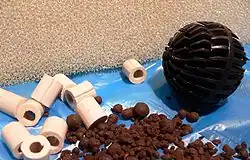 À l'exception notable des filtres à diatomées, les filtres d'aquarium ont rarement une action purement mécanique, car les bactéries vont coloniser la plupart des matériaux filtrants en effectuant un certain degré de filtration biologique[1]. Le charbon actif et les zéolites sont également fréquemment ajoutés aux filtres d'aquarium. Ces matériaux hautement poreux agissent comme des adsorbats liant divers produits chimiques à leurs grandes surfaces externes[2] et également comme des sites de colonisation bactérienne.