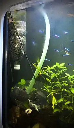 Les filtres de puissance ou HOB (hang on back), qui sont actionnés par une turbine, retirent l'eau de l'aquarium, généralement à l'aide d'un long tube de siphon, qui est ensuite poussé (ou tiré) à travers une série de différents médias filtrants et renvoyé dans l'aquarium. Ce sont les types de filtres d'aquarium les plus courants[1]. Ils sont généralement plus efficaces et plus faciles à entretenir que les filtres internes[13].