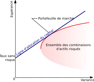 Cependant, les investisseurs peuvent aussi investir dans un actif au risque négligeable et délivrant un rendement certain (par exemple, une obligation d’État). En combinant cet actif sans risque à un portefeuille d’actifs risqués, ils peuvent obtenir tout couple espérance-variance situé sur une droite partant du taux sans risque et passant par l’espace des portefeuilles risqués. Seule la plus élevée de ces droites, dite « ligne d'allocation du capital », décrit des couples espérance-variance efficients, toutes les autres rémunérant moins le risque.