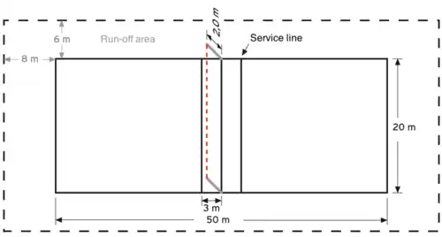 Un terrain extérieur a des dimensions de 50 mètres sur 20 mètres. Les lignes extérieures appartiennent au champ. Ainsi, lorsque le ballon touche une ligne, cela ne compte pas comme une erreur et le jeu continue. Le champ est divisé en deux par un ruban rayé blanc-rouge de 5 centimètres d'épaisseur à une hauteur de 2 mètres. La ligne de service est à 3 mètres de ce ruban. Lorsqu'un joueur sert, son pied devant ou son premier pied d'atterrissage doit être complètement derrière cette ligne. Il y a une zone de retrait autour du terrain, qui est reservé pour le jeu et dans laquelle aucun supporter ne peut se trouver.