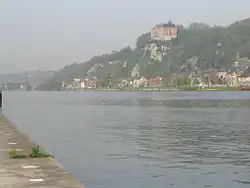 Une vue d'ensemble de Chokier et du château depuis la rive droite de la Meuse.