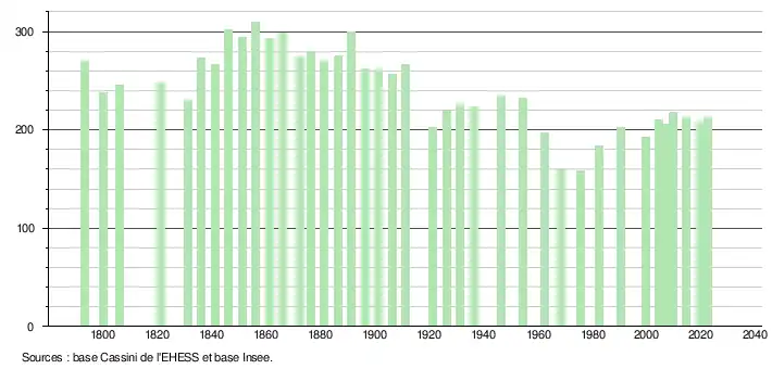 L'évolution du nombre d'habitants est connue à travers les recensements de la population effectués dans la commune depuis 1793. Pour les communes de moins de 10 000 habitants, une enquête de recensement portant sur toute la population est réalisée tous les cinq ans, les populations de référence des années intermédiaires étant quant à elles estimées par interpolation ou extrapolation[19]. Pour la commune, le premier recensement exhaustif entrant dans le cadre du nouveau dispositif a été réalisé en 2004[20].