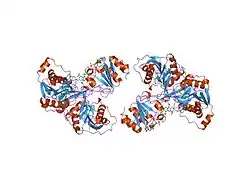 Le FAD est fixé dans une crevasse entre les domaines II et III tandis que la molécule d'AMP est liée au domaine III.